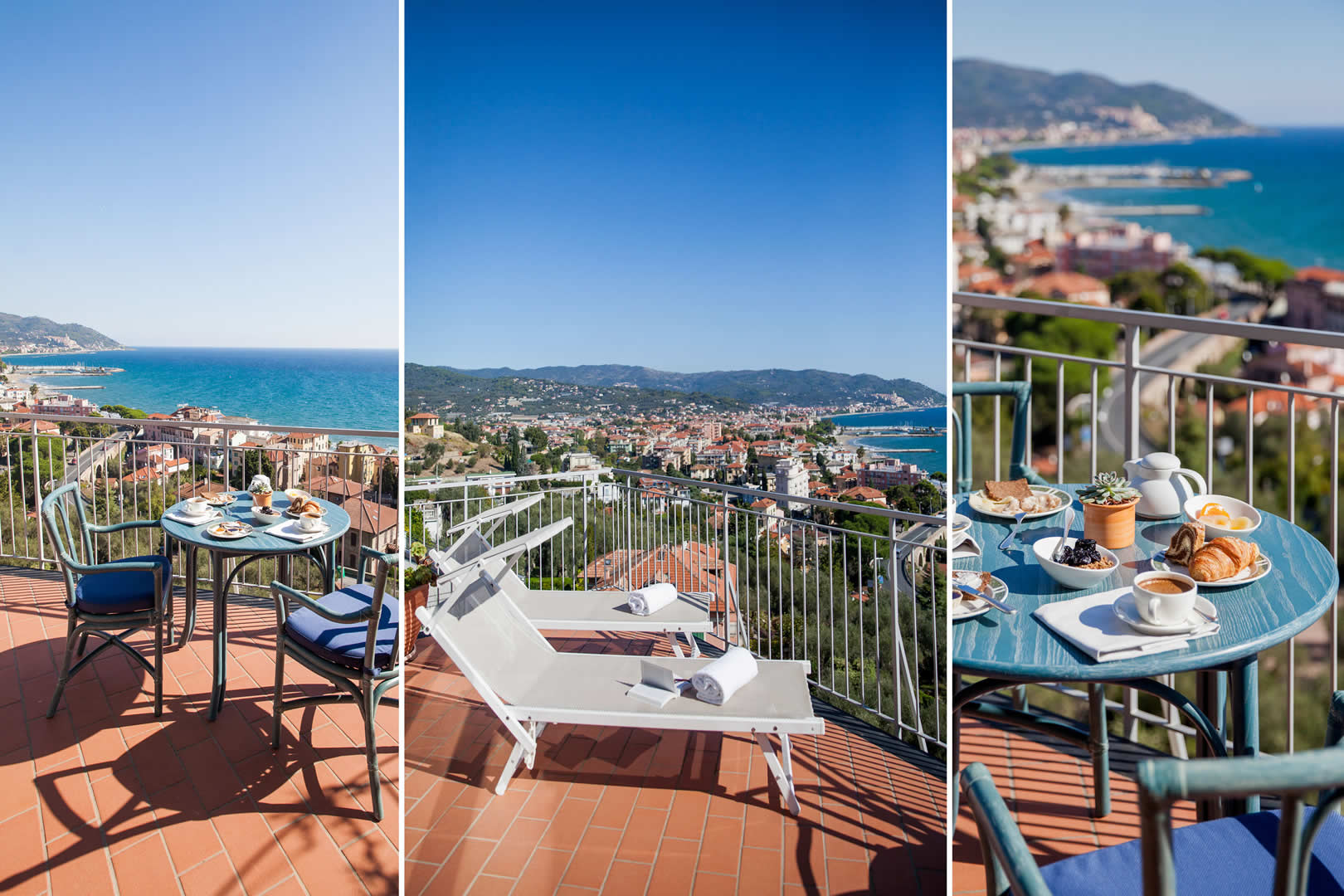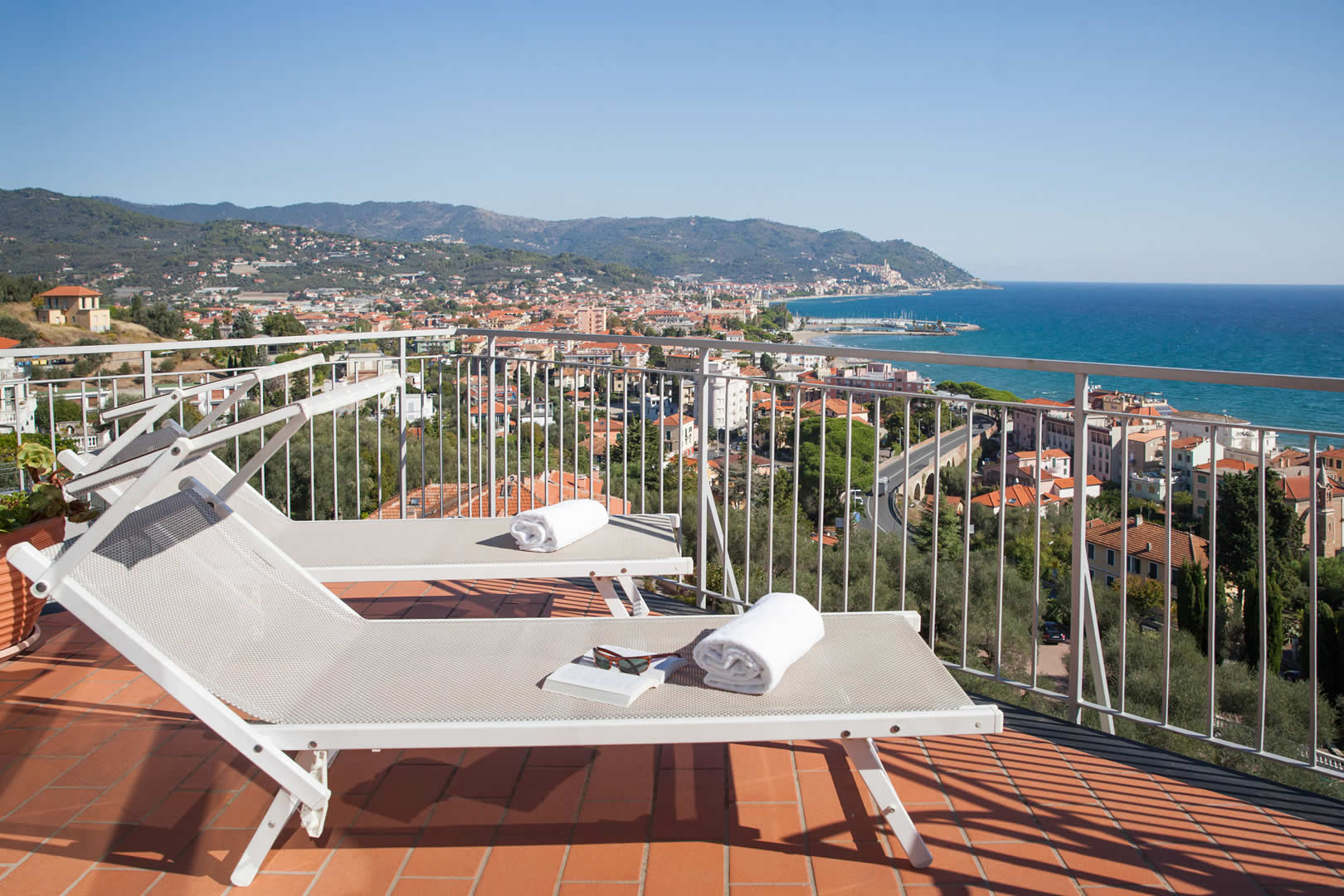 Das absolute Highlight ist die große private Terrasse mit Sonnenliegen und einem kleinen Tisch – perfekt, um die Meeresbrise zu genießen und den atemberaubenden Blick über den Golf von Diano Marina zu bewundern.